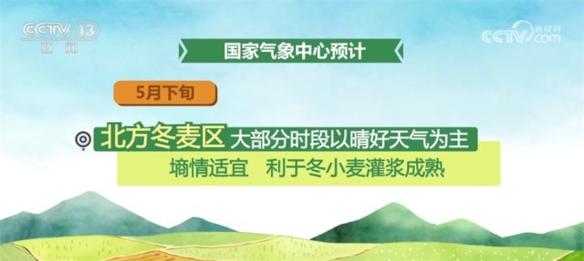 國家氣象中心預計,5月下旬,北方冬麥區大部分時段以晴好天氣為主,墑情適宜,利于冬小麥灌漿成熟;江漢、江南及四川盆地、貴州等地有較強降雨,夏收作業將短暫受阻;江淮大部天氣較好,適宜夏收。