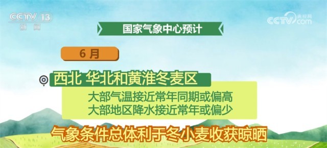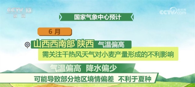 6月,西北、華北和黃淮冬麥區大部氣溫接近常年同期或偏高,大部地區降水接近常年或偏少,氣象條件總體利于冬小麥收獲晾曬;但山西西南部、陜西氣溫偏高,需關注干熱風天氣對小麥產量形成的不利影響,此外,氣溫偏高、降水偏少可能導致部分地區墑情偏差,不利于夏種。