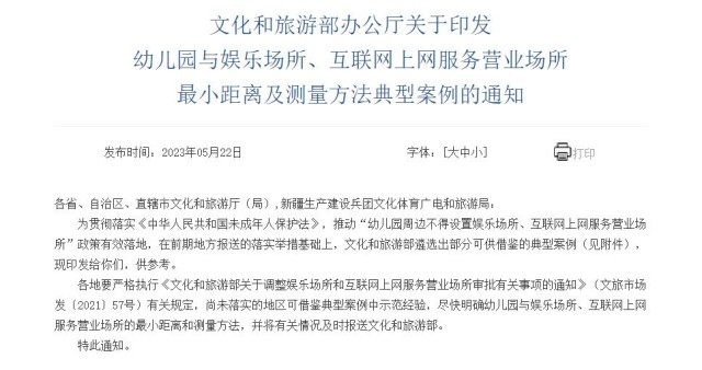 為貫徹落實《中華人民共和國未成年人保護法》,推動“幼兒園周邊不得設置娛樂場所、互聯網上網服務營業場所”政策有效落地,在前期地方報送的落實舉措基礎上,文化和旅游部遴選出部分可供借鑒的典型案例(見附件),現印發給你們,供參考。