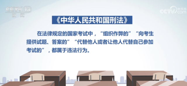 《中華人民共和國(guó)刑法》規(guī)定,在法律規(guī)定的國(guó)家考試中“組織作弊的”“向考生提供試題、答案的”“代替他人或者讓他人代替自己參加考試的”,都屬于違法行為?!蹲罡呷嗣穹ㄔ?、最高人民檢察院關(guān)于辦理組織考試作弊等刑事案件適用法律若干問題的解釋》明確,對(duì)在高考等國(guó)家教育考試中組織作弊的,將直接認(rèn)定為“情節(jié)嚴(yán)重”行為,處三年以上七年以下有期徒刑并處罰金。