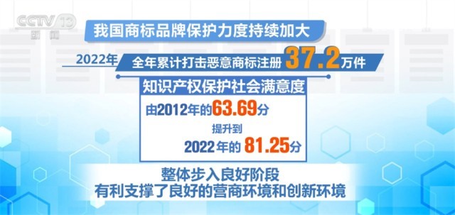 央視網消息:第十三屆中國國際商標品牌節昨天(6月17日)在東莞開幕,國家知識產權局相關負責人介紹,我國商標品牌保護力度持續加大,2022年全年累計打擊惡意商標注冊37.2萬件,知識產權保護社會滿意度由2012年的63.69分提升到去年的81.25分,整體步入良好階段,有利支撐了良好的營商環境和創新環境。