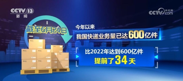 國家郵政局數據顯示,截至6月24日,今年以來我國快遞業務量已達600億件,比2022年達到600億件提前了34天。