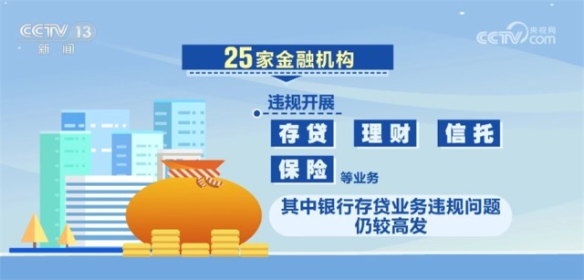 25家金融機(jī)構(gòu)違規(guī)開展存貸、理財、信托、保險等業(yè)務(wù),其中銀行存貸業(yè)務(wù)違規(guī)問題仍較高發(fā)。