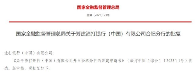 央視網消息:近日,國家金融監督管理總局發布《關于籌建渣打銀行(中國)有限公司合肥分行的批復》。主要內容如下: