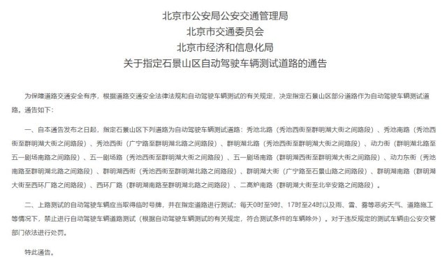 一、自本通告發布之日起,指定石景山區下列道路為自動駕駛車輛測試道路:秀池北路(秀池西街至群明湖大街之間路段)、秀池南路(秀池西街至群明湖大街之間路段)、秀池西街(廣寧路至群明湖北路之間路段)、群明湖北路(秀池西街至群明湖大街之間路段)、動力街(群明湖北路至五一劇場南路之間路段)、五一劇場路(秀池西街至群明湖大街之間路段)、五一劇場南路(群明湖西街至群明湖大街之間路段)、動力東街(秀池南路至群明湖北路之間路段)、群明湖西街(秀池西街至群明湖北路之間路段)、群明湖大街(廣寧路至石景山路之間路段)、群明湖南路(群明湖大街至西環廠路之間路段)、西環廠路(群明湖南路至群明湖北路之間路段)、二高爐南路(群明湖大街至北辛安路之間路段)。