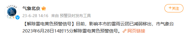 央視網消息:據@氣象北京微博消息,北京市解除冰雹黃色預警:目前,影響本市的雷雨云團已減弱移出,市氣象臺2023年6月28日14時15分解除雷電黃色預警信號。