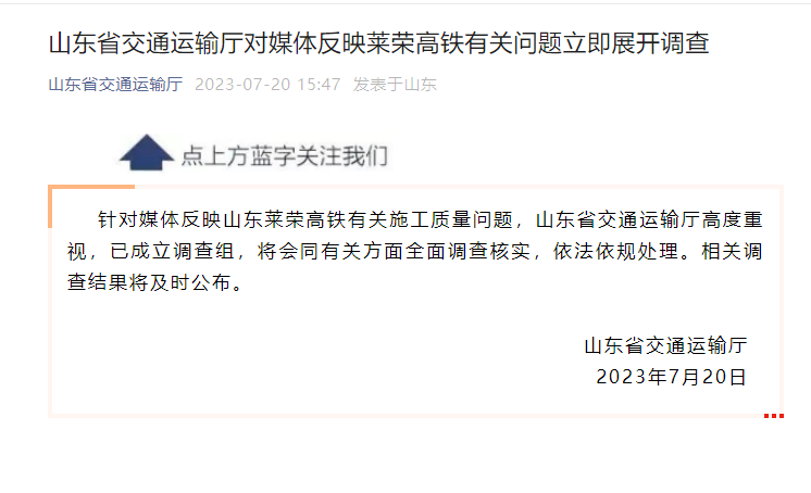 針對媒體反映山東萊榮高鐵有關施工質量問題,山東省交通運輸廳高度重視,已成立調查組,將會同有關方面全面調查核實,依法依規處理。相關調查結果將及時公布。