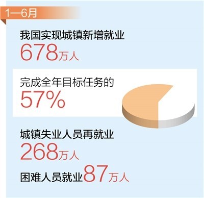 前6月,我國實現城鎮新增就業678萬人,完成全年目標任務的57% 就業形勢保持總體穩定