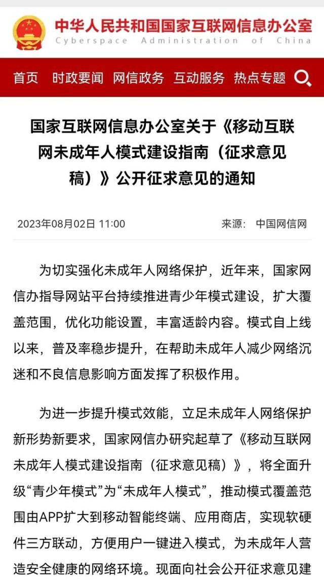 中國青年報客戶端北京8月2日電(中青報·中青網記者 何春中)國家網信辦今天公布《移動互聯網未成年人模式建設指南(征求意見稿)》(以下簡稱《征求意見稿》),將全面升級“青少年模式”為“未成年人模式”,推動模式覆蓋范圍由APP擴大到移動智能終端、應用商店,實現軟硬件三方聯動,并方便用戶一鍵進入模式,為未成年人營造安全健康的網絡環境。