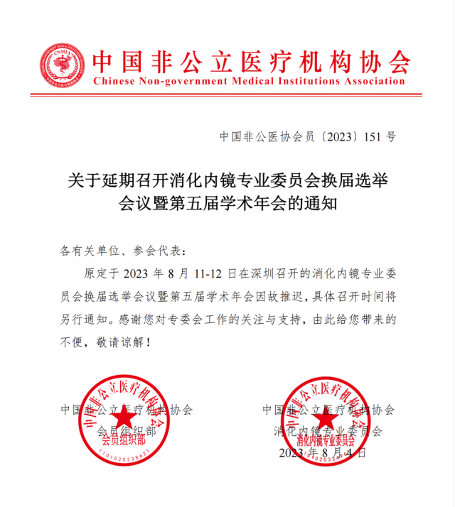 消化內鏡專業委員會換屆選舉會議暨第五屆學術年會延期通知。圖片來源:中國非公立醫療機構協會