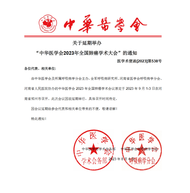 8月4日,中華醫學會2023年全國肺癌學術會議原定于2023年9月1-3日在河南省鄭州市召開,因故延期舉行,具體召開時間待定。