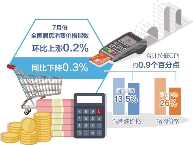 國家統計局數據顯示,今年7月份全國居民消費價格指數(CPI)環比上漲0.2%,由降轉漲;同比由上月持平轉為下降0.3%。工業生產者出廠價格指數(PPI)環比、同比降幅均收窄。