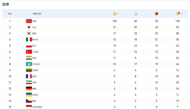 最終,中國代表團以103枚金牌、40枚銀牌、35枚銅牌,總計178枚獎牌的成績,位列金牌榜和獎牌榜雙第一。