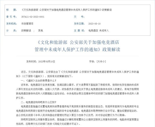 《文化和旅游部 公安部關于加強電競酒店管理中未成年人保護工作的通知》政策解讀