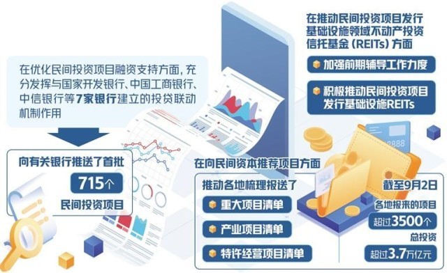 為貫徹落實(shí)《意見》,國家發(fā)展改革委印發(fā)了《關(guān)于進(jìn)一步抓好抓實(shí)促進(jìn)民間投資工作努力調(diào)動(dòng)民間投資積極性的通知》,提出了17項(xiàng)有針對性的具體措施。據(jù)介紹,在優(yōu)化民間投資項(xiàng)目融資支持方面,充分發(fā)揮與國家開發(fā)銀行、中國工商銀行、中信銀行等7家銀行建立的投貸聯(lián)動(dòng)機(jī)制作用,向有關(guān)銀行推送了首批715個(gè)民間投資項(xiàng)目,請有關(guān)金融機(jī)構(gòu)按照市場化、法治化原則,自主選擇符合條件的項(xiàng)目給予金融支持。在向民間資本推薦項(xiàng)目方面,推動(dòng)各地梳理報(bào)送了重大項(xiàng)目清單、產(chǎn)業(yè)項(xiàng)目清單、特許經(jīng)營項(xiàng)目清單。截至9月2日,各地報(bào)來的項(xiàng)目超過3500個(gè),總投資超過3.7萬億元。在推動(dòng)民間投資項(xiàng)目發(fā)行基礎(chǔ)設(shè)施領(lǐng)域不動(dòng)產(chǎn)投資信托基金(REITs)方面,加強(qiáng)前期輔導(dǎo)工作力度,積極推動(dòng)民間投資項(xiàng)目發(fā)行基礎(chǔ)設(shè)施REITs。近日,國家發(fā)展改革委向證監(jiān)會推薦了金風(fēng)科技風(fēng)力發(fā)電項(xiàng)目,這是推薦的首單民間投資清潔能源REITs項(xiàng)目。