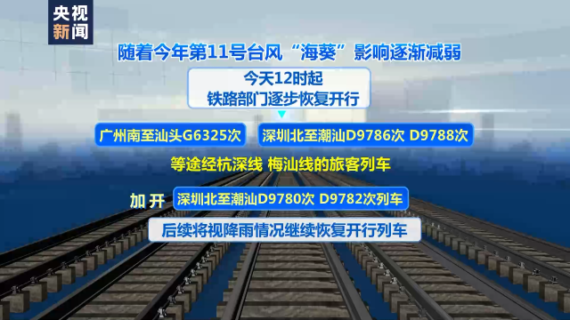 隨著今年第11號臺風“海葵”影響逐漸減弱,5日12時起,鐵路部門逐步恢復開行廣州南至汕頭G6325次、深圳北至潮汕D9786次、D9788次等途經杭深線、梅汕線的旅客列車,加開深圳北至潮汕D9780次、D9782次列車。后續(xù)將視降雨情況,繼續(xù)恢復開行列車。