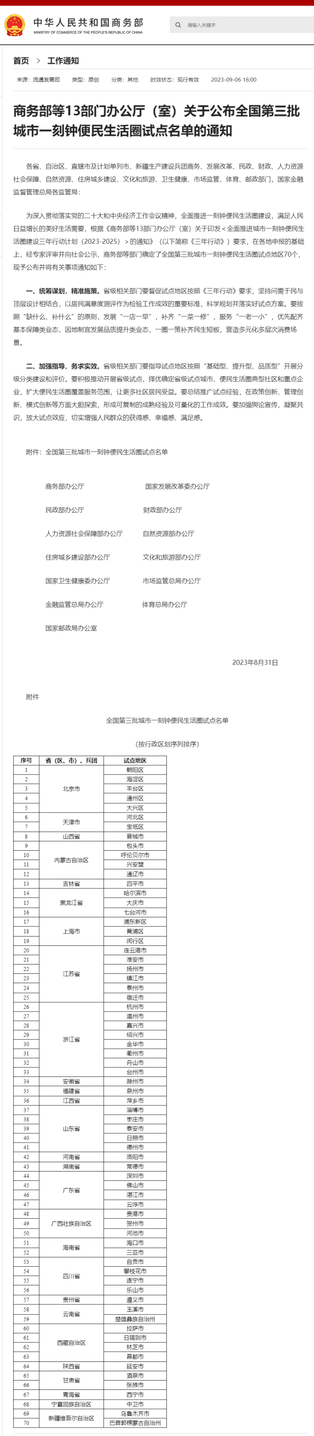 商務(wù)部等13部門:全國第三批城市一刻鐘便民生活圈試點地區(qū)70個
