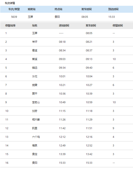 5640/5639次列車開行于貴陽和玉屏之間,中間途經(jīng)大大小小14個站——羊坪、青溪、蕉溪、鎮(zhèn)遠(yuǎn)、水花、施秉、黃平、寶老山、加勞、桐木寨、凱里、六個雞、福泉、貴定。