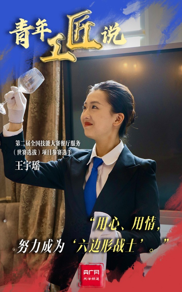 370余個考核點,對于第二屆全國技能大賽餐廳服務(世賽選拔)項目參賽選手王宇瑤來說,有著巨大的考驗。但面對困難,王宇瑤始終保持微笑,在老師的指導下練習調制雞尾酒、餐巾折花、餐桌擺盤成百上千次。整齊的著裝、得體大方的儀容、神采奕奕的狀態,一顰一笑皆為王宇瑤的細心巧思。“我將以此次比賽為契機,努力磨煉技藝,成為一名全面發展的‘六邊形戰士’?!蓖跤瞵幮χf道。