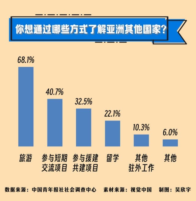 你會通過什么方式了解亞洲?68.1%的受訪者選擇了旅游,40.7%的受訪者選擇參與短期交流項目,32.5%的受訪者選擇參與援建共建項目,其他還有留學(22.1%)、駐外工作(10.3%)。
