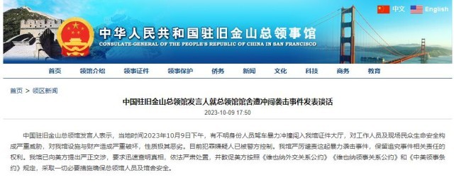 中國駐舊金山總領(lǐng)館發(fā)言人就總領(lǐng)館館舍遭沖闖襲擊事件發(fā)表談話