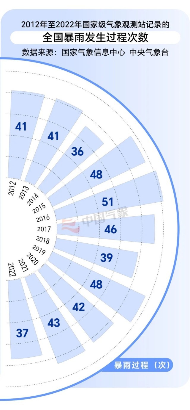我們通過數據了解下我國近年來的暴雨發生頻次。2012年至2022年間,我國共發生暴雨天氣過程472次,年均發生次數約為42.9次;2016年暴雨發生次數最多,為51次;2014年最少,為36次(2023年未結束,暫不計)。