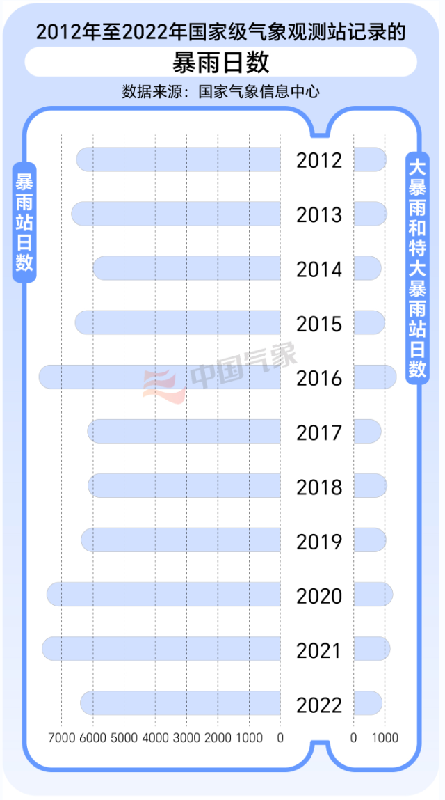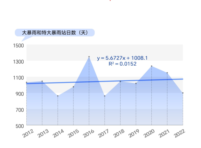 通過對大暴雨和特大暴雨站日數的統計,我們發現,2012年至2022年,我國大暴雨和特大暴雨的發生日數總體有緩慢增加的趨勢,即我國大暴雨天氣過程的持續時間或影響范圍總體有緩慢增加(擴大)的趨勢。