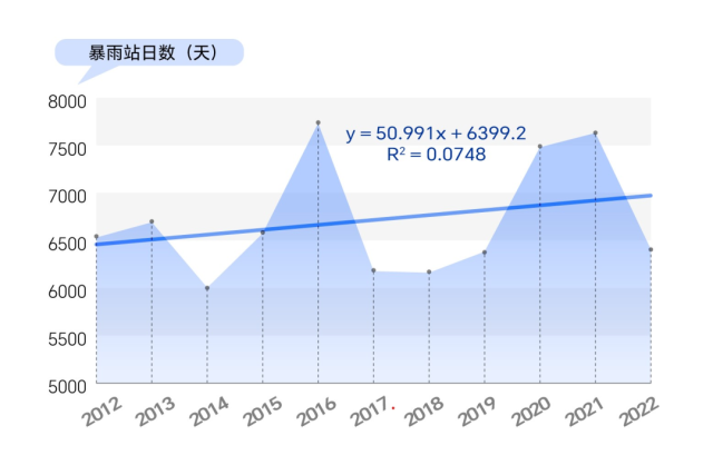 數據統計顯示,2012年至2022年,我國暴雨站日數有明顯的增加趨勢。這意味著,2012年到2022年,我國暴雨天氣過程的持續時間或影響范圍有增加(擴大)的趨勢。