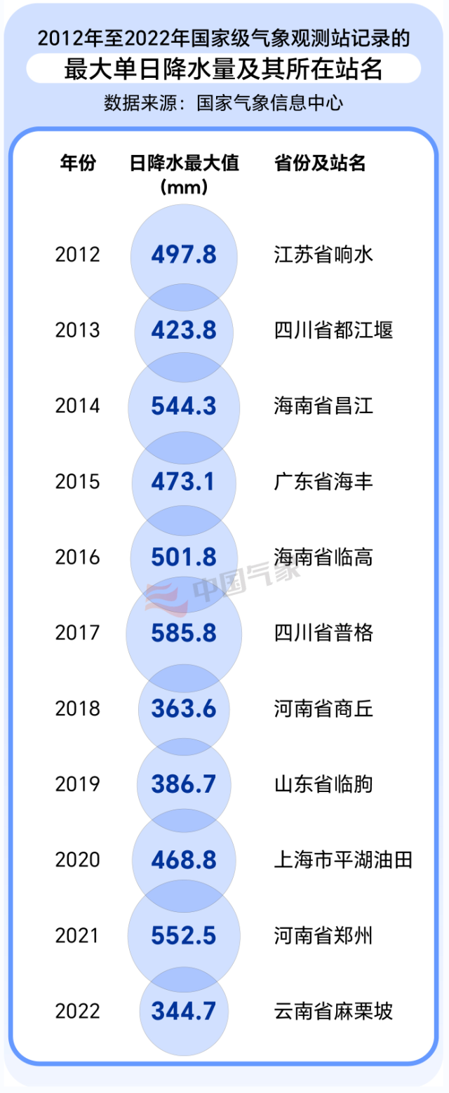 那么,近年來的單日最大降水量又是如何變化的呢?據國家氣象信息中心數據顯示,2012年至2022年,我國日降水量最大值分別出現在江蘇響水、四川都江堰、海南昌江、廣東海豐、海南臨高、四川普格、山東臨朐、上海平湖油田、河南鄭州、云南麻栗坡。
