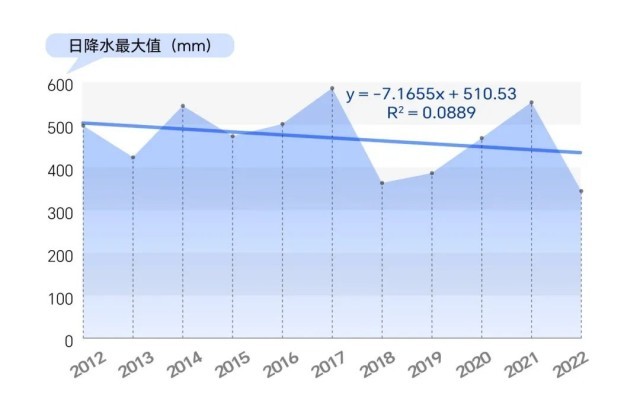 分析數據變化,可以看到,2012年到2022年我國日降水量最大值存在波動,總體有緩慢減少的趨勢。