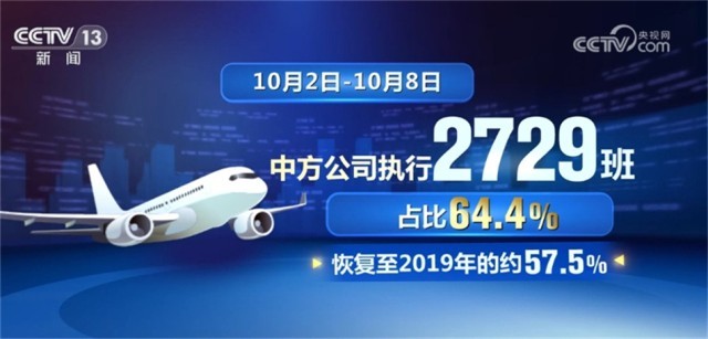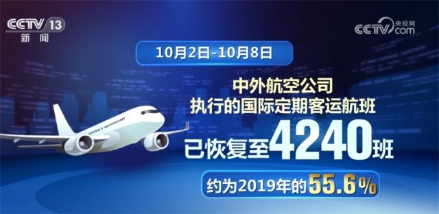民航局最新數據顯示,上周(10月2日—10月8日),中外航空公司執行的國際定期客運航班已恢復至4240班,約為2019年的55.6%;其中中方公司執行2729班,占比64.4%,恢復至2019年的約57.5%;外航執行1511班,占比35.6%,恢復至2019年的約42.5%。