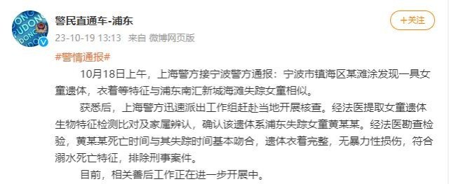 央視網消息:據@警民直通車-浦東 消息,10月18日上午,上海警方接寧波警方通報:寧波市鎮海區某灘涂發現一具女童遺體,衣著等特征與浦東南匯新城海灘失蹤女童相似。