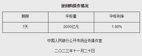 中新網11月20日電 據央行網站消息,為維護銀行體系流動性合理充裕,2023年11月20日人民銀行以利率招標方式開展了2050億元逆回購操作,中標利率1.80%,期限為7天。具體情況如下: