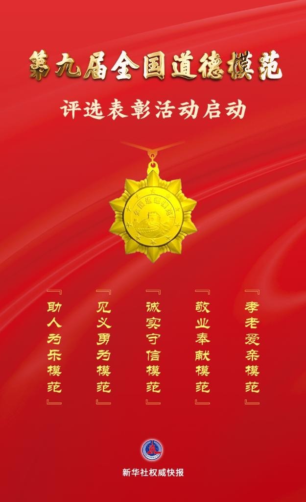 據悉,第九屆全國道德模范分為“助人為樂模范”“見義勇為模范”“誠實守信模范”“敬業奉獻模范”“孝老愛親模范”5個類別,通過群眾推薦、遴選審核、公示宣傳、投票評選等步驟評選產生。
