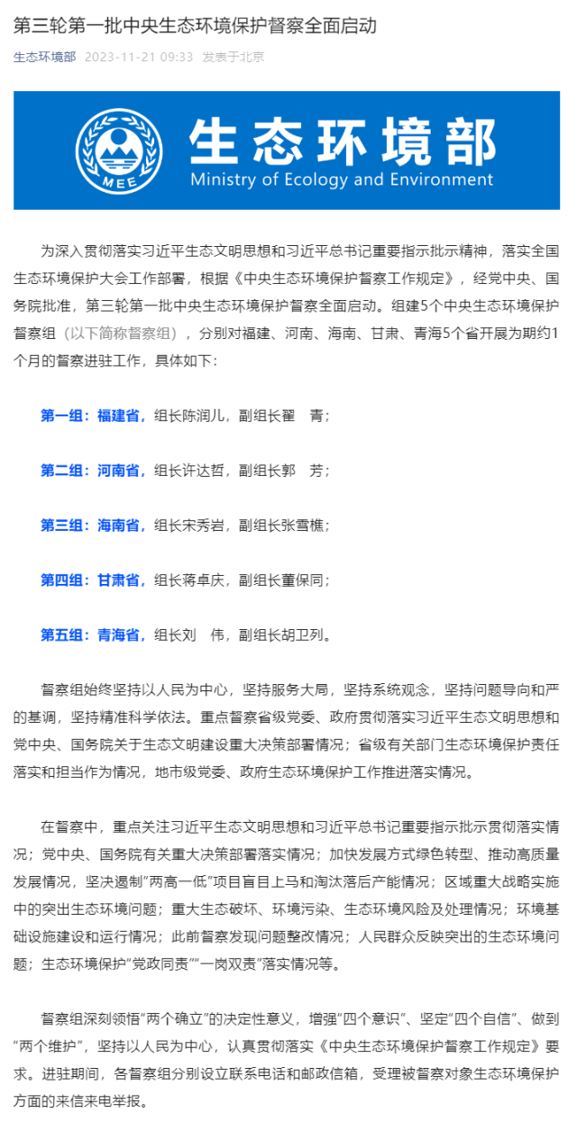 央視網消息:據生態環境部消息,為深入貫徹落實習近平生態文明思想和習近平總書記重要指示批示精神,落實全國生態環境保護大會工作部署,根據《中央生態環境保護督察工作規定》,經黨中央、國務院批準,第三輪第一批中央生態環境保護督察全面啟動。組建5個中央生態環境保護督察組(以下簡稱督察組),分別對福建、河南、海南、甘肅、青海5個省開展為期約1個月的督察進駐工作,具體如下:
