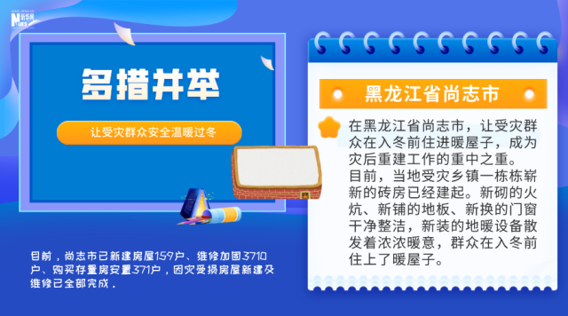 尚志市委書記劉海濤介紹,目前,尚志市已新建房屋159戶、維修加固3710戶、購買存量房安置371戶,因?yàn)?zāi)受損房屋新建及維修已全部完成。