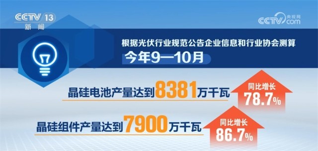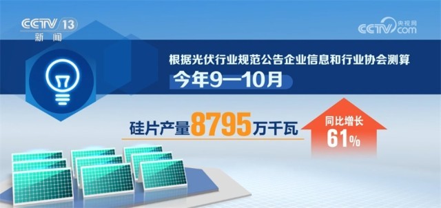 央視網消息:工業和信息化部昨天(12月13日)發布當前全國光伏制造行業最新運行情況。數據顯示,今年9—10月,我國光伏制造業保持高位運行,硅料、硅片、電池、組件產量同比增長均超60%。