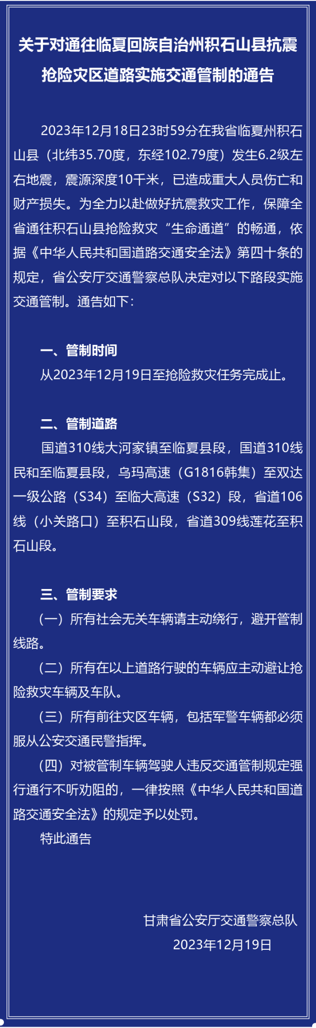 2023年12月18日23時59分在甘肅省臨夏州積石山縣發生6.2級左右地震,已造成重大人員傷亡和財產損失。為全力以赴做好抗震救災工作,保障甘肅全省通往積石山縣搶險救災“生命通道”的暢通,甘肅省公安廳交通警察總隊對抗震搶險災區道路實施交通管制,至搶險救災任務完成止,詳情如下: