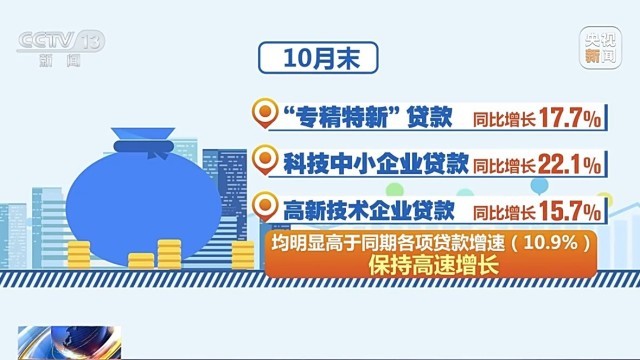 數據顯示,目前我國科技創新、制造業、綠色發展、普惠小微等重點領域貸款增量和占比都在明顯上升。10月末,“專精特新”、科技中小企業、高新技術企業貸款分別同比增長17.7%、22.1%、15.7%,均明顯高于同期各項貸款增速,保持高速增長。