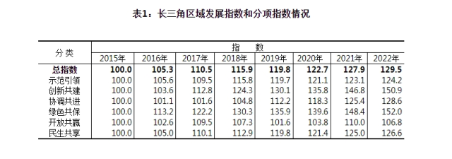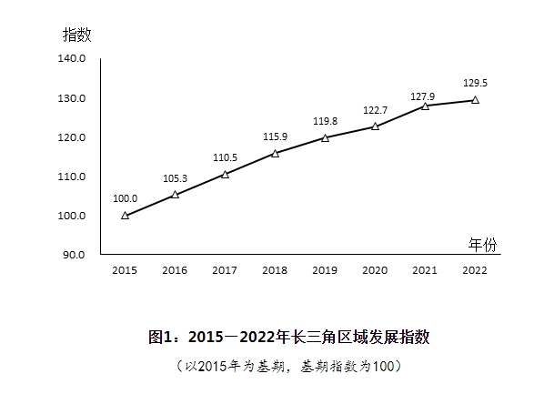 從測算結果看,以2015年為基期,2022年長三角區域發展指數為129.5,比上年提高1.6,年均提高4.2。