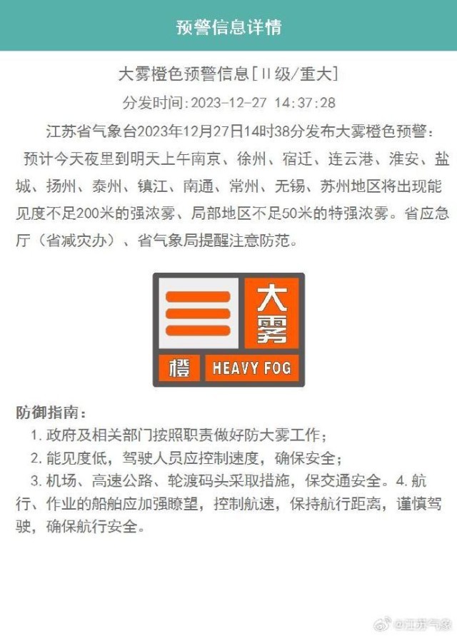 央視網(wǎng)消息:據(jù)@江蘇氣象 微博消息,江蘇省氣象臺2023年12月27日14時38分發(fā)布大霧橙色預警: 預計今天夜里到明天上午南京、徐州、宿遷、連云港、淮安、鹽城、揚州、泰州、鎮(zhèn)江、南通、常州、無錫、蘇州地區(qū)將出現(xiàn)能見度不足200米的強濃霧、局部地區(qū)不足50米的特強濃霧。江蘇省應急廳(省減災辦)、省氣象局提醒注意防范。