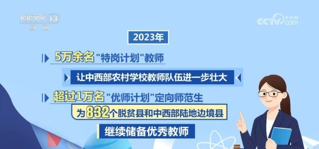 強教必先強師。2023年,5萬余名“特崗計劃”教師讓中西部農村學校教師隊伍進一步壯大,超過1萬名“優師計劃”定向師范生為832個脫貧縣和中西部陸地邊境縣繼續儲備優秀教師。
