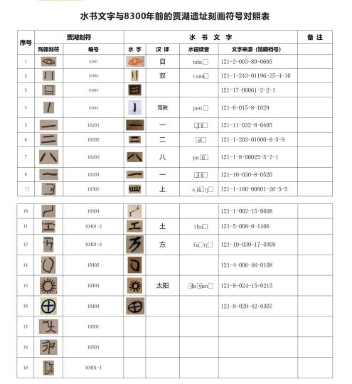 中國貴州省黔南布依族苗族自治州水書申報《世界記憶遺產名錄》領導小組辦公室、黔南州檔案館最新研究發現,中國水書文字與中國河南省偃師市二里頭夏都遺址出土的24個刻畫符號相同,與中國浙江省良渚文化遺址出土的700多個刻畫符號中的104個符號相同,與中國安徽省蚌埠市雙墩遺址出土的600多個刻畫符號中的73個符號相同,與中國河南省賈湖遺址出土的19個刻畫符號中的16個符號相同。