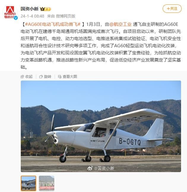 央視網(wǎng)消息:據(jù)@國資小新 消息,1月3日,由@航空工業(yè) 通飛自主研制的AG60E電動飛機(jī)在建德千島湖通用機(jī)場圓滿完成首次飛行。自項目啟動以來,研制團(tuán)隊先后開展了電機(jī)、電控、動力電池選型、電推進(jìn)系統(tǒng)集成試驗驗證、電動飛機(jī)安全性和適航符合性設(shè)計技術(shù)研究等多項工作,完成了AG60輕型運(yùn)動飛機(jī)電動化改裝,為電動飛機(jī)產(chǎn)品開發(fā)和現(xiàn)役固定翼飛機(jī)電動化改裝積累了寶貴經(jīng)驗,為搶抓航空動力變革戰(zhàn)略機(jī)遇,推進(jìn)戰(zhàn)略性新興產(chǎn)業(yè)布局,促進(jìn)低空經(jīng)濟(jì)產(chǎn)業(yè)發(fā)展奠定了堅實基礎(chǔ)。