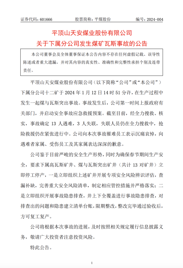 央視網(wǎng)消息:1月14日,平煤股份發(fā)布公告,下屬分公司十二礦于2024年1月12日14時(shí)51分許,在生產(chǎn)過程中發(fā)生一起煤與瓦斯突出事故。事故發(fā)生后,公司第一時(shí)間上報(bào)政府有關(guān)部門,并啟動(dòng)安全事故應(yīng)急救援預(yù)案。截至目前,經(jīng)全力搜救、核實(shí),事故確定13人遇難,3人失聯(lián),失聯(lián)人員仍在全力搜救中,搶險(xiǎn)救援仍在緊張進(jìn)行中。公司向本次事故罹難員工表示沉痛哀悼,向遇難者家屬、受傷員工及其家屬表達(dá)深深的歉意。