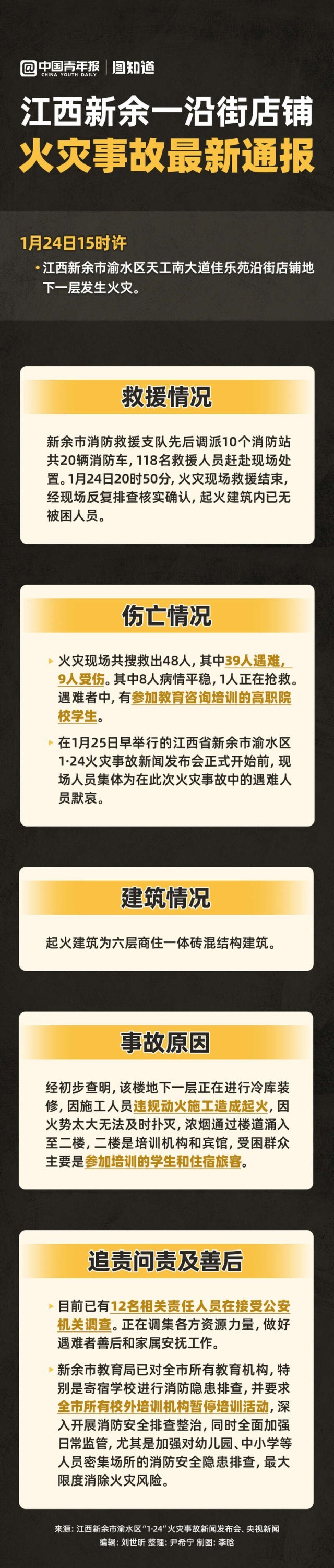 1月25日8時,江西省新余市渝水區“1·24”火災事故新聞發布會通報,渝水區一沿街店鋪發生火災,造成39人遇難,9人受傷。遇難者中,有參加教育咨詢培訓的高職院校學生。經初步查明,事故原因系施工人員違規動火施工造成起火。目前,已有12名相關責任人員接受公安機關調查。此外,新余市要求全市所有校外培訓機構暫停培訓活動,深入開展消防安全排查整治。
