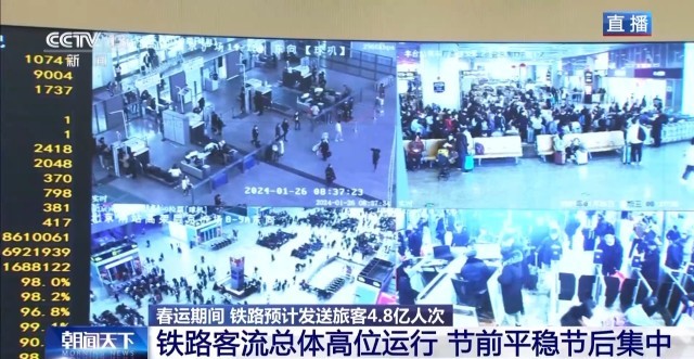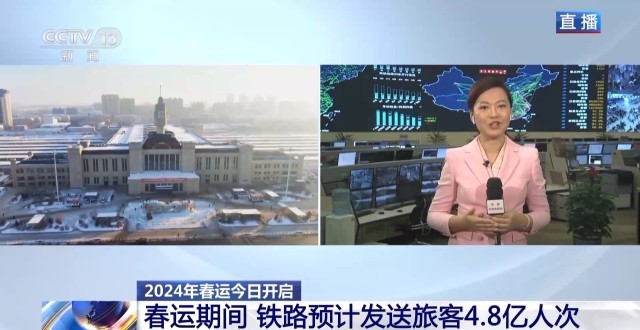 總臺央視記者 陳晰:40天春運,全國鐵路預計發送旅客4.8億人次,日均1200萬人次。今天是春運首日,全國鐵路預計發送旅客1060萬人次。2024年春運的火車票預售已經從1月12日開始發售,從目前的售票情況來看,旅客出行需求旺盛。