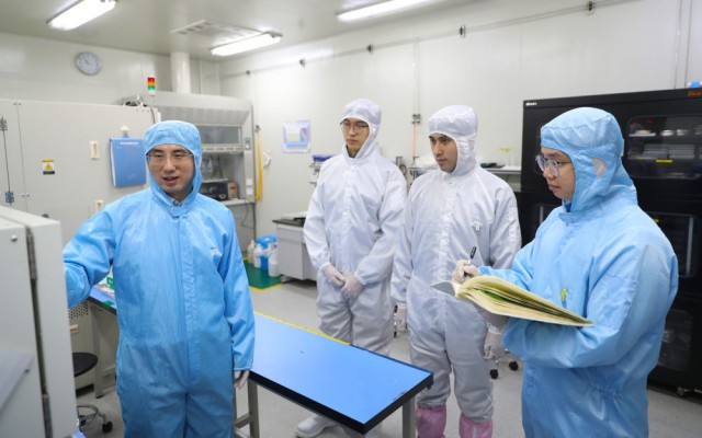 在位于沈陽市的中國(guó)科學(xué)院金屬研究所納米碳基電子器件超凈實(shí)驗(yàn)室,孫東明(左一)與指導(dǎo)的研究生一起討論反應(yīng)離子刻蝕工藝設(shè)備的使用方法和注意事項(xiàng)(2月24日攝)。