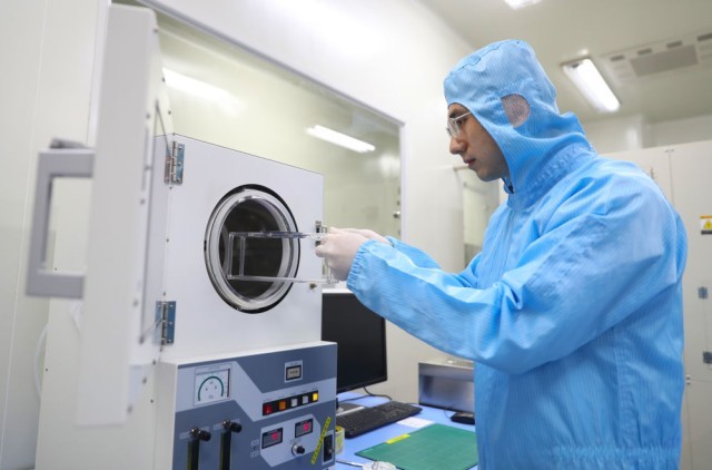 在位于沈陽市的中國(guó)科學(xué)院金屬研究所納米碳基電子器件超凈實(shí)驗(yàn)室,孫東明從前處理設(shè)備腔體中取出實(shí)驗(yàn)樣品(2月24日攝)。