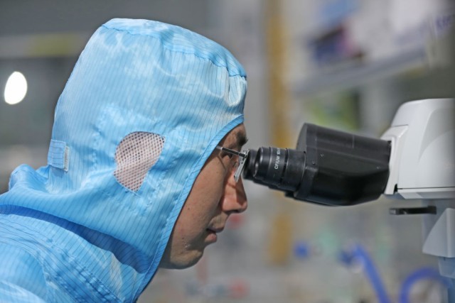 在位于沈陽市的中國(guó)科學(xué)院金屬研究所納米碳基電子器件超凈實(shí)驗(yàn)室,孫東明在聚焦光學(xué)顯微鏡前觀測(cè)實(shí)驗(yàn)樣品的形貌(2月24日攝)。